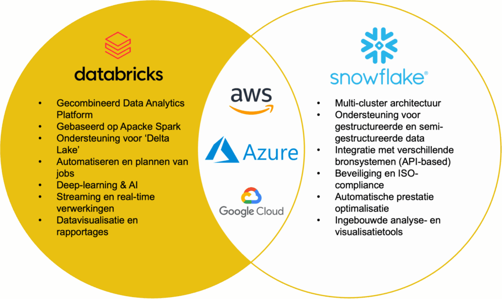 Zowel Snowflake als Databricks draaien op deze cloudplatformen. Ze gebruik allebei dus de infrastructuur van bijvoorbeeld Azure of AWS, maar bieden daarbovenop een specialistische data-laag voor opslag, verwerking en analyse.