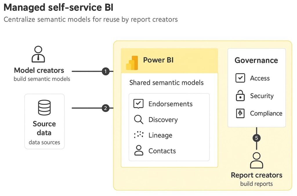 In de onderstaande afbeelding wordt schematisch weergegeven hoe een versimpelde self service Power BI omgeving eruit kan zien, waarbij gebruik wordt gemaakt van centrale semantic models en governance zonder afhankelijk te zijn van Microsoft Fabric.
